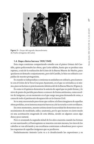 Esta etapa comienza compartiendo estudio con el pintor Gómez del Castillo, quien policromaba las obras, que León tallaba, hasta que se produce una ruptura, a raíz de la realización del Cristo de la Buena Muerte de Huelva, pues quedaron en firmarlo conjuntamente, pero del Castillo, lo hizo en solitario a espaldas de nuestro protagonista. Es cuando se independiza y comienza su andadura en solitario, precisamente con el Cristo de la Vera Cruz para Ayamonte, en el que se reivindica a sí mismo, pues su factura es prácticamente idéntica del de la Buena Muerte (Figura 3). Es como si él quisiera demostrar la autoría de aquel que no pudo firmar, y le sirve de punto de partida para darse a conocer de forma autónoma, como escultor de imágenes, en un momento en el que surge una gran demanda de estas, a causa de todo el patrimonio desaparecido en la Guerra Civil. Se ve muy encorsetado pues tiene que ceñirse a la línea imaginera de aquellas obras perdidas, en su inmensa mayoría barrocas y de la escuela o corte sevillanos. En estos momentos, nuestro artista siente la necesidad de demostrar sus conocimientos de modelado, talla y anatomía, por lo que incurre en cierto modo en una acentuación exagerada de esta última, siendo en algunos casos algo dura y poco natural. Pero es avanzada la segunda mitad de los años cuarenta cuando las formas se van suavizando y el barroquismo se muestra con más mesura, los rizos de los cabellos se van aliviando y sus esculturas comienzan a abandonar poco a poco los esquemas de aquellas imágenes que se perdieron. Paulatinamente Antonio León va a ir desafectando las expresiones y su