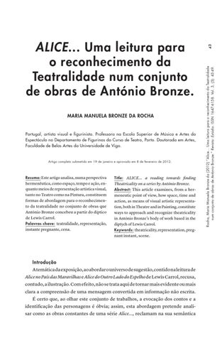43 Rocha, Maria Manuela Bronze da (2012) “Alice… Uma leitura para o reconhecimento da Teatralidade num conjunto de obras de António Bronze.” Revista :Estúdio. ISSN 1647-6158. Vol. 3, (5): 43-49.