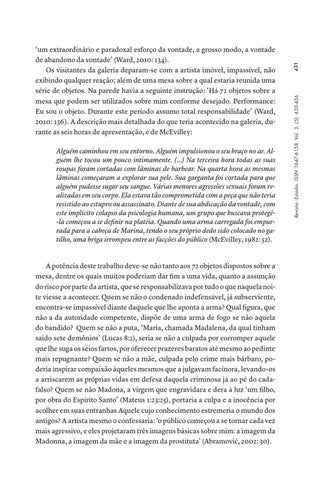 ‘um extraordinário e paradoxal esforço da vontade, a grosso modo, a vontade de abandono da vontade’ (Ward, 2010: 134). Os visitantes da galeria deparam-se com a artista imóvel, impassível, não exibindo qualquer reação; além de uma mesa sobre a qual estaria reunida uma série de objetos. Na parede havia a seguinte instrução: ‘Há 72 objetos sobre a mesa que podem ser utilizados sobre mim conforme desejado. Performance: Eu sou o objeto. Durante este período assumo total responsabilidade’ (Ward, 2010: 136). A descrição mais detalhada do que teria acontecido na galeria, durante as seis horas de apresentação, é de McEvilley: