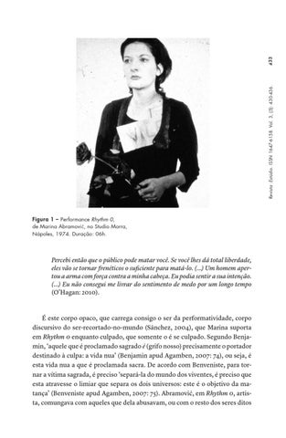 É este corpo opaco, que carrega consigo o ser da performatividade, corpo discursivo do ser-recortado-no-mundo (Sánchez, 2004), que Marina suporta em Rhythm 0 enquanto culpado, que somente o é se culpado. Segundo Benjamin, ‘aquele que é proclamado sagrado é (grifo nosso) precisamente o portador destinado à culpa: a vida nua’ (Benjamin apud Agamben, 2007: 74), ou seja, é esta vida nua a que é proclamada sacra. De acordo com Benveniste, para tornar a vítima sagrada, é preciso ‘separá-la do mundo dos viventes, é preciso que esta atravesse o limiar que separa os dois universos: este é o objetivo da matança’ (Benveniste apud Agamben, 2007: 75). Abramović, em Rhythm 0, artista, comungava com aqueles que dela abusavam, ou com o resto dos seres ditos