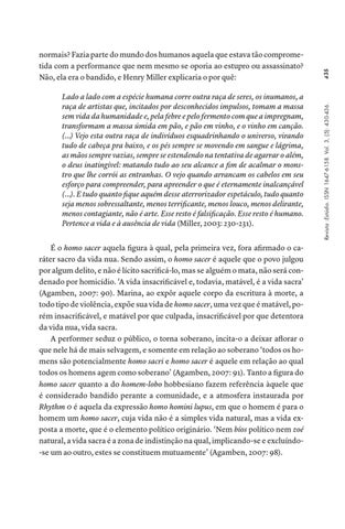 Lado a lado com a espécie humana corre outra raça de seres, os inumanos, a raça de artistas que, incitados por desconhecidos impulsos, tomam a massa sem vida da humanidade e, pela febre e pelo fermento com que a impregnam, transformam a massa úmida em pão, e pão em vinho, e o vinho em canção. (...) Vejo esta outra raça de indivíduos esquadrinhando o universo, virando tudo de cabeça pra baixo, e os pés sempre se movendo em sangue e lágrima, as mãos sempre vazias, sempre se estendendo na tentativa de agarrar o além, o deus inatingível: matando tudo ao seu alcance a fim de acalmar o monstro que lhe corrói as entranhas. O vejo quando arrancam os cabelos em seu esforço para compreender, para apreender o que é eternamente inalcançável (...). E tudo quanto fique aquém desse aterrorizador espetáculo, tudo quanto seja menos sobressaltante, menos terrificante, menos louco, menos delirante, menos contagiante, não é arte. Esse resto é falsificação. Esse resto é humano. Pertence a vida e à ausência de vida (Miller, 2003: 230-231). É o homo sacer aquela figura à qual, pela primeira vez, fora afirmado o caráter sacro da vida nua. Sendo assim, o homo sacer é aquele que o povo julgou por algum delito, e não é lícito sacrificá-lo, mas se alguém o mata, não será condenado por homicídio. ‘A vida insacrificável e, todavia, matável, é a vida sacra’ (Agamben, 2007: 90). Marina, ao expôr aquele corpo da escritura à morte, a todo tipo de violência, expõe sua vida de homo sacer, uma vez que é matável, porém insacrificável, e matável por que culpada, insacrificável por que detentora da vida nua, vida sacra. A performer seduz o público, o torna soberano, incita-o a deixar aflorar o que nele há de mais selvagem, e somente em relação ao soberano ‘todos os homens são potencialmente homo sacri e homo sacer é aquele em relação ao qual todos os homens agem como soberano’ (Agamben, 2007: 91). Tanto a figura do homo sacer quanto a do homem-lobo hobbesiano fazem referência àquele que é considerado bandido perante a comunidade, e a atmosfera instaurada por Rhythm 0 é aquela da expressão homo homini lupus, em que o homem é para o homem um homo sacer, cuja vida não é a simples vida natural, mas a vida exposta a morte, que é o elemento político originário. ‘Nem bíos político nem zoé natural, a vida sacra é a zona de indistinção na qual, implicando-se e excluíndo-se um ao outro, estes se constituem mutuamente’ (Agamben, 2007: 98).