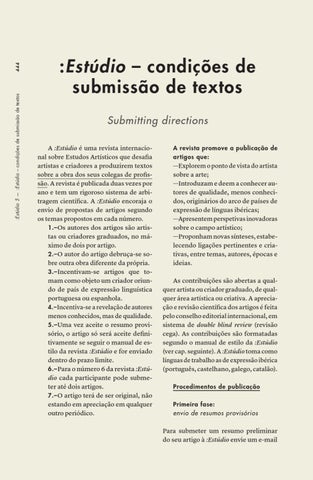 :Estúdio – condições de submissão de textos Submitting directions A :Estúdio é uma revista internacional sobre Estudos Artísticos que desafia artistas e criadores a produzirem textos sobre a obra dos seus colegas de profissão. A revista é publicada duas vezes por ano e tem um rigoroso sistema de arbitragem científica. A :Estúdio encoraja o envio de propostas de artigos segundo os temas propostos em cada número. 1.– Os autores dos artigos são artistas ou criadores graduados, no máximo de dois por artigo. 2.– O autor do artigo debruça-se sobre outra obra diferente da própria. 3.– Incentivam-se artigos que tomam como objeto um criador oriundo de país de expressão linguística portuguesa ou espanhola. 4.– Incentiva-se a revelação de autores menos conhecidos, mas de qualidade. 5.– Uma vez aceite o resumo provisório, o artigo só será aceite definitivamente se seguir o manual de estilo da revista :Estúdio e for enviado dentro do prazo limite. 6.– Para o número 6 da revista :Estúdio cada participante pode submeter até dois artigos. 7.– O artigo terá de ser original, não estando em apreciação em qualquer outro periódico.