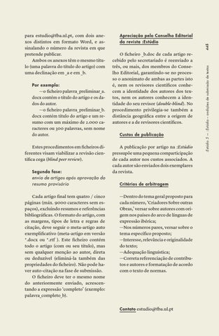 A publicação por artigo na :Estúdio pressupõe uma pequena comparticipação de cada autor nos custos associados. A cada autor são enviados dois exemplares da revista. Critérios de arbitragem