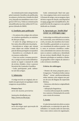 As comunicações mais categorizadas pela Comissão Científica são publicadas no número 5 da Revista :Estúdio de Abril 2013, lançada em simultâneo com o Congresso CSO’2013. Todas as comunicações são publicadas nas Atas online do IV Congresso (dotada de ISBN).
