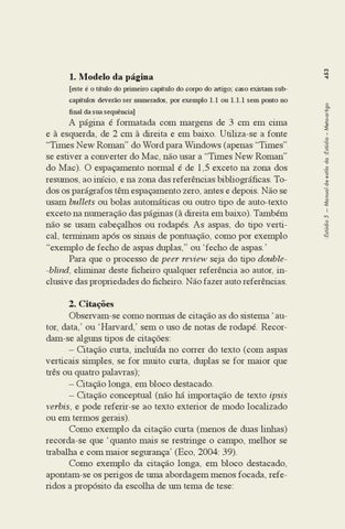 2. Citações Observam-se como normas de citação as do sistema ‘autor, data,’ ou ‘Harvard,’ sem o uso de notas de rodapé. Recordam-se alguns tipos de citações: – Citação curta, incluída no correr do texto (com aspas verticais simples, se for muito curta, duplas se for maior que três ou quatro palavras); – Citação longa, em bloco destacado. – Citação conceptual (não há importação de texto ipsis verbis, e pode referir-se ao texto exterior de modo localizado ou em termos gerais). Como exemplo da citação curta (menos de duas linhas) recorda-se que ‘quanto mais se restringe o campo, melhor se trabalha e com maior segurança’ (Eco, 2004: 39). Como exemplo da citação longa, em bloco destacado, apontam-se os perigos de uma abordagem menos focada, referidos a propósito da escolha de um tema de tese: