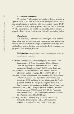 Castelazo, Tomas (2009) Detalle de la puerta de la celda 18 de la vieja cárcel de León, Guanajuato, México. [Consult. 2009‑05‑26] Fotografia. Disponível em <URL: http:// commons.wikimedia.org/wiki/File:Cell_door_detail.jpg> Eco, Umberto (2007) Como se Faz uma Tese em Ciências Humanas. Lisboa: Presença. ISBN: 978-972-23-1351-3 Fraipont, Edouard sobre obra de Raul Mourão (2001) A instalação “O carro/A grade/O ar,” exposta no Panorama da Arte Brasileira, 2001, no Museu de Arte Moderna de São Paulo. [Consult. 2009‑05‑26] Fotografia. Disponível em <URL: http://commons.wikimedia.org/wiki/File:CarrosGradeAr.jpg> Mendenhall, WC (1906) The Agassiz statue, Stanford University, California: April 1906 [Consult. 2009‑05‑26] Fotografia. Disponível em <URL: http://commons.wikimedia.org/wiki/ File:Agassiz_statue_Mwc00715.jpg > Morberg, Niklas (2009) Juicy Salif. [Consult. 2009‑05‑26] Fotografia. Disponível em <URL: http://commons. wikimedia.org/wiki/File:Juicy_Salif_-_78365.jpg>
