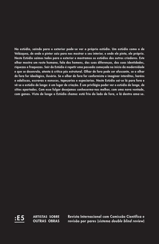 :ESTÚDIO 5 2012 ISSN 1647 – 6158 No estúdio, saindo para o exterior pode-se ver o próprio estúdio. Um estúdio como o de Velázquez, de onde o pintor saiu para nos mostrar o seu interior, e onde ele pinta, ele próprio. Neste Estúdio saímos todos para o exterior e mostramos os estúdios dos outros criadores. Este olhar mostra um rosto humano, fala dos homens, das suas diferenças, das suas identidades, riquezas e fraquezas. Sair do Estúdio é repetir uma passada começada no início da modernidade e que se desenrola, atenta à crítica pós estrutural. Olhar de fora pode ser ofuscante, se o olhar de fora for ideológico, ilusório. Se o olhar de fora for conformista e imaginar interditos, haréns e odaliscas, escravas e eunucos, tapeçarias e especiarias. Neste Estúdio sai-se lá para fora e vê-se o estúdio de longe: é um lugar de criação. É um privilégio poder ver o estúdio de longe, de sítios apartados. Com esse fulgor desejamos conhecermo-nos melhor, com uma nova vontade, com ganas. Visto de longe o Estúdio chama: está frio do lado de fora, e lá dentro ama-se.