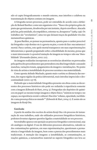 A partir da análise dos escritos do artista Kenji Ota e do processo de instauração de seus trabalhos, onde são utilizados processos fotográficos históricos, podemos levantar algumas questões ligadas a materialidade no seu processo. Seu trabalho aparece em oposição ao processo fotográfico convencional, seja ele analógico ou digital. O uso de diferentes processos alternativos, valendo-se das contaminações químicas, em suas experimentações, questionam a permanência e longevidade da imagem, bem como a pureza dos procedimentos mais tradicionais. A mutação das imagens: a instabilidade, as contaminações, as reações químicas, a metamorfose material no suporte fotográfico nos leva ao