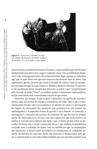 opostos: branco/ausência do branco. Presume-se que na elaboração do Desenho tenha havido uma luta entre o negar e o afirmar, entre o dar a visibilidade/iluminar e o de, consequentemente, lha retirar/eliminar. Aqui, apenas se vislumbra algo que se quer dizer mas que não interessa literalmente fazê-lo; talvez seja importante, apenas, mostrar que existe a intenção de o fazer: o que se consubstancia numa energia da ação criativa: a dialética iluminar-eliminar. É o processo de canalização dessa energia que interessa ao autor e que é propulsionada pela vontade de poder “dizer”, ou melhor, pensar o sentimento, numa palavra, tomar consciência dele, transmitindo a prova de que existe. Desenhos são formas. O que as gera é memórias carregadas de emoção e afectos (que são formas de energia restauradoras da vida). Mas o que é transmitido pelas formas não é as memórias e os afectos do autor, é a provocação do cogitar do observador das memórias que pertencem ao seu próprio ser autobiográfico e à respectiva forma de pensar e ver o Mundo. O conteúdo, a mensagem e a intenção não passam da projecção do que decorre na própria mente de observadores; é, de facto, um acto subjectivo, que neste terreno de análise é evocado para explicar que tudo o que o Outro profira sobre os desenhos do Autor não é senão a projecção do eu e que podem eventualmente coincidir com a realidade do Autor; isto, na medida em que os sentimentos são universais. A forma como associamos os sentimentos às realidades depende da história de cada um. Todo este processo é fundamental para gerar a comunicação (e uma intersubjectividade) que nos permite assumir uma