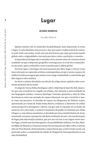 Quanto maiores são os tentáculos da globalização mais importante se torna o lugar. O valor distintivo das pessoas e das suas ações é indissociável do contexto onde estão ancoradas, sendo este um dos factores que mais pesa num mundo global, onde a originalidade e inovação prevalece sobre a perfeição e a mestria. A importância do lugar não é estranha à Arte, mesmo antes de vivermos numa realidade em que a dispersão geográfica converge para os ecrãs dos computadores pessoais, agora conhecidos como as janelas para a aldeia global. Em bom rigor, o não lugar, tal como proposto por Marc Augé, é até por vezes mais relevante na expressão artística contemporânea, já que é nestes espaços de indiferenciados passagem que muitas vezes surge a intimidade e criatividade que dão origem à obra artística. As obras e artistas abordados na seleção de artigos deste capítulo estão certamente próximos desta noção. O artigo de Teresa Palma Rodrigues sobre o Hip Hop de Sam the Kid, demostra que este só poderia ter surgido em Chelas, não obstante a universalidade da sua linguagem artística. Gustavo Henrique Torrezan apresenta a obra de Elias dos Bonecos como um exemplo do espaço itinerante em que o território é quase como um percurso. O desenho do espaço na xilogravura de Fabrício Lopez, apresentado por Ynaiá de Paula Souza Barros, evidencia a dimensão do atelier numa perspectiva abrangente e aberta, em que este se expande até ao limite da natureza. Por outro lado, o notável cruzamento da grafite no feminino por Drika Chagas e a arte urbana amazônica, é abordado por Sissa Aneleh Batista de Assis, remetendo-nos para a perspectiva da democratização da arte e da transformação do lugar pela intervenção artística, que por sua vez tem a sua origem neste mesmo lugar, criando um ciclo divergente e de possibilidades infinitas. Por fim, Marina Milito de Medeiros e Sayonara Sousa Pereira lançam um olhar sobre a extensa obra de Pina Bausch, demonstrando a importância que a intervenção social, em particular sobre a comunidade da cidade de Wuppertal, desempenharam na sua obra Kontakthof.