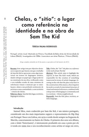 in the work of Sam The Kid Abstract: This article aims to highlight the aspects, in Sam The Kid’s work, which are responsible for the creation of something transversal in terms of artistic language, focusing on the role that the place may have in the construction of his musics, observing how his work is a result of a intertwined structure of visual and musical references, combined with a deep sense of belonging to a community and to a territory – Chelas neighborhood. Keywords: Sam the Kid, place, territory, artistic language.