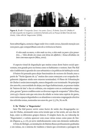 Sem subterfúgios, nomeia o lugar onde vive e onde cresce, fazendo menção aos seus pares, que compartilham com ele a vivência no bairro. O sítio onde eu moro, o sítio onde eu vivo, o sítio onde eu paro e fico pensativo... / Sítio divido em zonas com letras do alfabeto / Zonas divididas em lotes com mau aspecto (Mira, 2002). O aspecto visual de degradação que muitas zonas deste bairro social apresentam, tem grande peso na forma como os habitantes o sentem. Sam The Kid não é indiferente à questão do caos urbanístico e às políticas de habitação social. O bairro foi pensado para alojar funcionários de sectores do Estado; mas a partir do “Verão Quente de 75” muitas das casas começam a ser ocupadas ilegalmente (algumas ainda sem estarem terminadas). O Plano de Urbanização de Chelas é assim interrompido, nunca chegando a ser terminado. No princípio dos anos 80, a necessidade de alojar, nos fogos habitacionais, as pessoas vindas de ‘bairros de lata’ e das ex-colónias, em conjunto com as continuadas ocupações, geram “graves conflitos entre as diversas vagas de ocupantes” (Silva Dias, 2001:43) e fazem com que esta área da cidade se torne uma espécie de gueto, com vários espaços degradados e ao abandono e sem uma congregação efectiva das referidas zonas, nomeadas nos anos 60, por: I, J, N1, N2 ou M. 2. De ‘Chelas’ a ‘Negociantes’