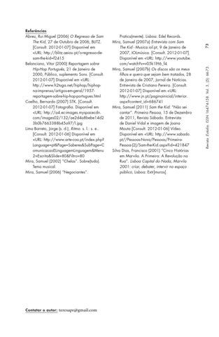 Referências Abreu, Rui Miguel (2006) O Regresso de Sam The Kid, 27 de Outubro de 2006, BLITZ. [Consult. 2012‑01‑07] Disponível em <URL: http://blitz.aeiou.pt/o-regresso-desam-the-kid=f2415 Belanciano, Vítor (2000) Reportagem sobre Hip-Hop Português, 21 de Janeiro de 2000, Público, suplemento Sons. [Consult. 2012‑01‑07] Disponível em <URL: http://www.h2tuga.net/hiphop/hiphopna-imprensa/artigos-em-geral/1957reportagem-sobre-hip-hop-portugues.html Coelho, Bernardo (2007) STK. [Consult. 2012‑01‑07] Fotografia. Disponível em <URL: http://a4.ec-images.myspacecdn. com/images02/132/ae2d4a8bebe14d2 3b0b7663388b45a97/l.jpg Lima Barreto, Jorge (s. d.), Ritmo. s. l.: s. e.. [Consult. 2012‑01‑06] Disponível em <URL: http://www.arte-coa.pt/index.php? Language=pt&Page=Saberes&SubPage=C omunicacaoELinguagemLinguagem&Menu 2=Escrita&Slide=80&Filtro=80 Mira, Samuel (2002) “Chelas”. Sobre(tudo). Tema musical. Mira, Samuel (2006) “Negociantes”.