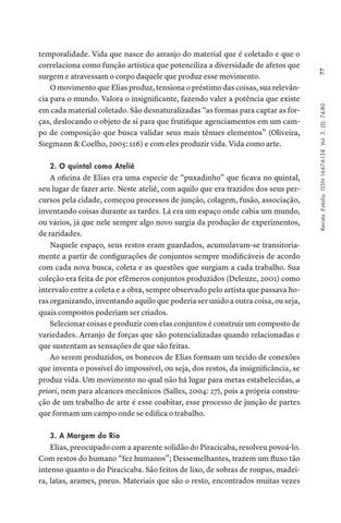 temporalidade. Vida que nasce do arranjo do material que é coletado e que o correlaciona como função artística que potenciliza a diversidade de afetos que surgem e atravessam o corpo daquele que produz esse movimento. O movimento que Elias produz, tensiona o préstimo das coisas, sua relevância para o mundo. Valora o insignificante, fazendo valer a potência que existe em cada material coletado. São desnaturalizadas “as formas para captar as forças, deslocando o objeto de si para que frutifique agenciamentos em um campo de composição que busca validar seus mais tênues elementos” (Oliveira, Siegmann & Coelho, 2005: 116) e com eles produzir vida. Vida como arte.