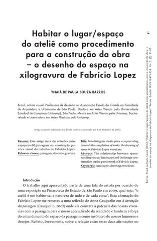 81 Barros, Ynaiá de Paula Souza (2012) “Habitar o lugar/espaço do ateliê como procedimento para a construção da obra: o desenho do espaço na xilogravura de Fabrício Lopez.” Revista :Estúdio. ISSN 1647-6158. Vol. 3, (5): 81-85.