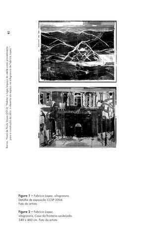 Figura 1 – Fabrício Lopez, xilogravura. Detalhe de exposição CCSP 2004. Foto do artista. Figura 2 – Fabrício Lopez, xilogravura, Casa da frontaria azuleijada. 340 x 460 cm. Foto do artista.