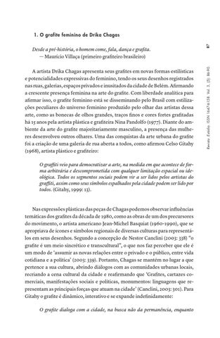 A artista Drika Chagas apresenta seus grafites em novas formas estilísticas e potencialidades expressivas do feminino, tendo os seus desenhos registrados nas ruas, galerias, espaços privados e inusitados da cidade de Belém. Afirmando a crescente presença feminina na arte do grafite. Com liberdade analítica para afirmar isso, o grafite feminino está se disseminando pelo Brasil com estilizações peculiares do universo feminino produzido pelo olhar das artistas dessa arte, como as bonecas de olhos grandes, traços finos e cores fortes grafitadas há 15 anos pela artista plástica e grafiteira Nina Pandolfo (1977). Diante do ambiente da arte do grafite majoritariamente masculino, a presença das mulheres desenvolveu outros olhares. Uma das conquistas da arte urbana do grafite foi a criação de uma galeria de rua aberta a todos, como afirmou Celso Gitahy (1968), artista plástico e grafiteiro: O graffiti veio para democratizar a arte, na medida em que acontece de forma arbitrária e descomprometida com qualquer limitação espacial ou ideológica. Todos os segmentos sociais podem vir a ser lidos pelos artistas do graffiti, assim como seus símbolos espalhados pela cidade podem ser lido por todos. (Gitahy, 1999: 13).