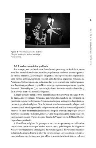 Em suas peças é predominante desenhos de personagens femininos, como a mulher amazônica urbana e a mulher popular com símbolos e cores vigorosas da cultura paraense. As ilustrações caligráficas são representantes legítimas de uma cultura estética, feminina e social, voltada para a expressão feminina na Amazônia. Sob meu ponto de vista, uma das representantes da mulher paraense e da cultura popular da região Norte em expressão contemporânea é o grafite Banho de Cheiro (Figura 1), da intervenção de rua Ver-o-risco realizada no dia 27 de março de 2011 - dia nacional do grafite. Chagas trouxe o olhar sobre a mulher amazônica que vive na região Norte do Brasil. As personagens femininas caricaturadas da artista se conjugam em harmonia com novas formas do feminino dadas para as imagens da cultura paraense. A procissão religiosa Círio de Nazaré (atualmente considerada por muitos estudiosos a maior procissão religiosa do Brasil e maior evento religioso do mundo) foi uma das referências locais usadas pela artista na exposição Cidade Labirinto, realizada em Belém, em 2011. Uma das personagens da exposição foi inspirada em sua avó (Figura 2), que é devota da Virgem Maria de Nazaré homenageada na procissão. A identidade religiosa do povo paraense está na personagem estilizada e vestida com um manto - que lembra a veste usada pela imagem da Virgem de Nazaré – que representa a fé religiosa da cultura regional do Pará mais reconhecida mundialmente. É uma mulher de características sacrossantas e com um ar imaculado que nos faz imaginar que o Pará tem uma alma feminina em todos os
