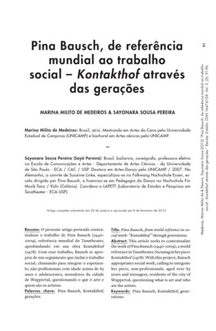 91 Medeiros, Marina Milito de & Pereira, Sayonara Sousa (2012) “Pina Bausch, de referência mundial ao trabalho social - Kontakthof através das gerações.” Revista :Estúdio. ISSN 1647-6158. Vol. 3, (5): 91-96.
