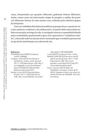 video.php?v=1587508360885 L´arche (2007) Pina Bausch. Paris: L´arche. Mackrell, Judith (2010) Give me an over-65 dancer any day [Consult. 2011‑11‑24] Disponível em <URL: http://www. guardian.co.uk/culture/2010/apr/07/ critics-notebook-judith-mackrell Pereira, Sayonara (2010) Rastros do Tanztheater no Processo Criativo de ESBOÇO: Espetáculo Cênico com alunos do Instituto de Artes da UNICAMP. São Paulo: Anna Blume.