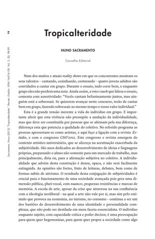 98 Sacramento, Nuno (2012) “Tropicalteridade.” Revista :Estúdio. ISSN 1647-6158. Vol. 3, (5): 98-99.