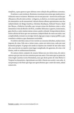 simplista, e para quem se quer afirmar como solução dos problemas correntes. O artista e a arte resistem. Resistem e mostram-nos coisas que muito provavelmente nunca veríamos. Mostram-nos no um para um - através do artista que olha para a obra de outro artista - os lugares, os cheiros, os eventos que nada têm de matemático ou de mensurável. Através destes olhares aproximamo-nos das subjetividades de Helga Gamboa, Christian Bendayan, Edward Venero, Raid das Moças, e Roberta Carvalho, que versam coisas tão distintas como a selva Amazónica vista do Brasil e do Perú, a mulher Africana e a guerra, transexuais, gays, heróis, e entre muitas outras coisas o poder colonial. A importância destes textos advém do facto que nos mostram a subjetividade do outro em toda a sua complexidade, tornam-no em algo visível, algo que ocupa o espaço público, que constitui o coletivo a que chamamos sociedade. O coletivo não fala a uma só voz e resiste ao consenso absoluto, muitas vezes imposto de cima. Fala sim a várias vozes, canta em vários tons, cada um com harmonia própria. O grupo não anula os sujeitos em virtude de um valor mais alto, mas investe no sujeito como lugar complicado, de agonismo, de crise e de drama, onde se sedimentam histórias. Os autores deste conjunto de ensaios falam-nos em vários tons, de outros autores que por sua vez nos remetem para um outro. Um outro que no ponto de vista Anglo-saxónico seria Orientalista, mas que deste ponto de vista Ibérico é Tropical ou Amazónico. Aproximam-nos dele e fazem-nos sentir o seu calor. A sua presença é tão forte que logo nos apercebemos que o outro do outro, afinal somos nós.