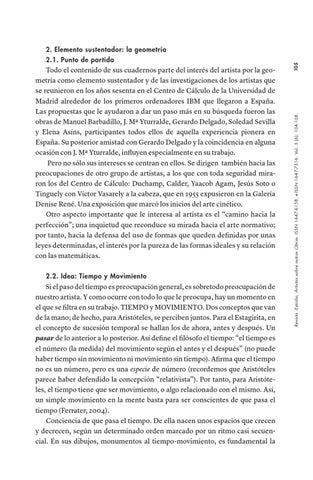 Todo el contenido de sus cuadernos parte del interés del artista por la geometría como elemento sustentador y de las investigaciones de los artistas que se reunieron en los años sesenta en el Centro de Cálculo de la Universidad de Madrid alrededor de los primeros ordenadores IBM que llegaron a España. Las propuestas que le ayudaron a dar un paso más en su búsqueda fueron las obras de Manuel Barbadillo, J. Mª Yturralde, Gerardo Delgado, Soledad Sevilla y Elena Asíns, participantes todos ellos de aquella experiencia pionera en España. Su posterior amistad con Gerardo Delgado y la coincidencia en alguna ocasión con J. Mª Yturralde, influyen especialmente en su trabajo. Pero no sólo sus intereses se centran en ellos. Se dirigen también hacia las preocupaciones de otro grupo de artistas, a los que con toda seguridad miraron los del Centro de Cálculo: Duchamp, Calder, Yaacob Agam, Jesús Soto o Tinguely con Víctor Vasarely a la cabeza, que en 1955 expusieron en la Galería Denise René. Una exposición que marcó los inicios del arte cinético. Otro aspecto importante que le interesa al artista es el “camino hacia la perfección”; una inquietud que reconduce su mirada hacia el arte normativo; por tanto, hacia la defensa del uso de formas que queden definidas por unas leyes determinadas, el interés por la pureza de las formas ideales y su relación con las matemáticas. 2.2. Idea: Tiempo y Movimiento