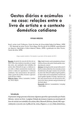 109 Herzog, Vivian (2012) “Gestos diários e acúmulos na casa: relações entre o livro de artista e o contexto doméstico cotidiano.” Revista :Estúdio, Artistas sobre outras Obras. ISSN 1647-6158, e-ISSN 1647-7316. Vol. 3 (6): 109-114.