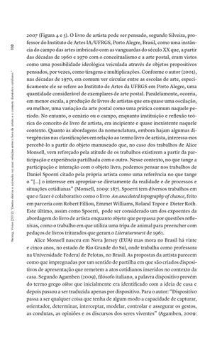 2007 (Figura 4 e 5). O livro de artista pode ser pensado, segundo Silveira, professor do Instituto de Artes IA/UFRGS, Porto Alegre, Brasil, como uma instância do campo das artes imbricado com as vanguardas do século XX que, a partir das décadas de 1960 e 1970 com o conceitualismo e a arte postal, eram vistos como uma possibilidade ideológica veiculada através de objetos propositivos pensados, por vezes, como tiragens e multiplicações. Conforme o autor (2001), nas décadas de 1970, era comum ver circular entre as escolas de arte, especificamente ele se refere ao Instituto de Artes da UFRGS em Porto Alegre, uma quantidade considerável de exemplares de arte postal. Paralelamente, ocorria, em menor escala, a produção de livros de artistas que era quase uma oscilação, ou melhor, uma variação da arte postal como uma prática comum naquele período. No entanto, o cenário ou o campo, enquanto instituição e reflexão teórica do conceito de livro de artista, era incipiente e quase inexistente naquele contexto. Quanto às abordagens da nomenclatura, embora hajam algumas divergências nas classificações em relação ao termo livro de artista, interessa-nos percebê-lo a partir do objeto manuseado que, no caso dos trabalhos de Alice Monsell, vem reforçado pela atitude de os trabalhos existirem a partir da participação e experiência partilhada com o outro. Nesse contexto, no que tange a participação e interação com o objeto livro, podemos pensar nos trabalhos de Daniel Spoerri citado pela própria artista como uma referência no que tange o “[...] o interesse em apropriar-se diretamente da realidade e de processos e situações cotidianas” (Monsell, 2009: 187). Spoerri tem diversos trabalhos em que o fazer é colaborativo como o livro An anecdoted topography of chance, feito em parceria com Robert Filliou, Emmet Williams, Roland Topor e Dieter Roth. Este último, assim como Spoerri, pode ser considerado um dos expoentes da abordagem do livro de artista enquanto objeto que perpassa por questões reflexivas, como o trabalho em que utiliza uma tripa de animal para preencher com pedaços de livros triturados que geram o Literaturwurst de 1961. Alice Monsell nasceu em Nova Jersey (EUA) mas mora no Brasil há vinte e cinco anos, no estado de Rio Grande do Sul, onde trabalha como professora na Universidade Federal de Pelotas, no Brasil. As propostas da artista parecem como que impregnadas por um sentido de partilha em que são criados dispositivos de apresentação que remetem a atos cotidianos inseridos no contexto da casa. Segundo Agamben (2009), filósofo italiano, a palavra dispositivo provém do termo grego oikos que inicialmente era identificado com a ideia de casa e depois passou a ser traduzida apenas por dispositivo. Para o autor: “Dispositivo passa a ser qualquer coisa que tenha de algum modo a capacidade de capturar, orientador, determinar, interceptar, modelar, controlar e assegurar os gestos, as condutas, as opiniões e os discursos dos seres viventes” (Agamben, 2009: