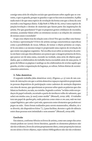 consigo uma série de relações sociais que questionam sobre aquilo que se consome, o que se guarda, porque se guarda e o que se faz com os acúmulos. A pilha nada mais é do que uma espécie de revelação da forma com que a dona da casa esconde a sua bagunça diária. O flip book A Pilha de Sá, 2005 é uma espécie de junção/revelação e destino de materiais que fazem parte das inquietações da artista. Por que guardamos? O que os pequenos gestos cotidianos de esconder, arrumar, acumular falam sobre as estruturas sociais e as relações de consumo de nossas casas e sociedade? O que esse objeto traz da relação com o livro? Por que escolher este formato, forma e apresentação? O livro de artista carrega características específicas como a possibilidade de tocar, folhear, de tornar o objeto próximo ao corpo, tê-lo em mãos e ao mesmo tempo ir propiciando uma espécie de revelação do que existe nas páginas seguintes. Tal escolha recai sobre as intenções da artista em fazer com que descubramos aos poucos que a imagem primeira do livro, que parece ser de uma cama, esconde na verdade, uma série de objetos guardados, que a colaboradora do trabalho havia escondido atrás de uma porta. O gesto de folhear as páginas é análogo ao da colaboradora de revelar aquilo que guarda, revelar a organização da bagunça, as sobras. Sobras diárias de acontecimentos anteriores.