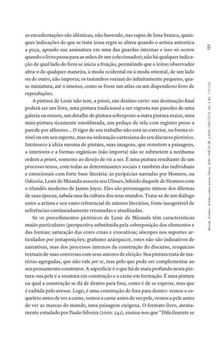 as encadernações são idênticas, não havendo, nas capas de lona branca, quaisquer indicações do que se trata (essa regra se altera quando o artista autentica a peça, apondo sua assinatura em uma das guardas internas e isso só ocorre quando o livro passa para as mãos de um colecionador); não há qualquer indicação de qual lado do livro se inicia a fruição, permitindo que o leitor/observador abra-o de qualquer maneira, à moda ocidental ou à moda oriental, de um lado ou de outro, não importa; os tamanhos variam do infinitamente pequeno, quase miniatura, até o imenso, como se fosse um atlas ou um dispendioso livro de reproduções. A pintura de Lenir não tem, a priori, um destino certo: sua destinação final poderá ser um livro, uma pintura tradicional a ser exposta nas paredes de uma galeria ou museu, um detalhe de pintura sobreposto a outra pintura maior, uma mini-pintura ricamente emoldurada, um pedaço de tela com registro preso a parede por alfinetes... O rigor de seu trabalho não está no exterior, na forma visível ou em seu suporte, mas na ordenação cartesiana do seu discurso pictórico. Intrínseco à idéia mesma de pintura, suas imagens, que remetem a paisagens, a interiores e a formas orgânicas (não importa) não se submetem a nenhuma ordem a priori, somente ao desejo de vir a ser. É uma pintura resultante de um processo tenso, com todas as determinantes sociais e também das individuais e emocionais com forte base literária: às peripécias narradas por Homero, na Odisséia, Lenir de Miranda associa seu Ulisses, híbrido daquele de Homero com o irlandês moderno de James Joyce. Eles são personagens síntese dos dilemas de suas épocas, tabula rasa da cultura dos seus mundos. Trata-se de um diálogo entre a artista e seu vasto referencial de autores literários, fonte inesgotável de referências continuadamente retomadas e atualizadas. Se os procedimentos pictóricos de Lenir de Miranda têm características muito particulares (perspectiva substituída pela sobreposição dos elementos e das formas; saturação das cores cruas e evocativas; síncopes nos suportes articulados por justaposições; grafismo anárquico), estes não são indicativos de narrativas, mas dos processos internos da construção do discurso, resquícios textuais de suas conversas com seus autores de eleição. Sua pintura trata de matérias agregadas, que não vale per se, mas pelo que pode ser complementar ao seu pensamento construtor. A superfície é o que há de mais profundo nesta pintura: sua pele é a ossatura em construção e a carne em formação. È uma pintura na qual a construção se dá de dentro para fora, como é de se esperar, mas que é exibida pelo avesso. Logo, é uma construção de fora para dentro: vemos o esqueleto antes de ver a carne, vemos a carne antes de ver pele, vemos a pele antes de ver as marcas do mundo, uma paisagem exógena. O formato livro, atentamente estudado por Paulo Silveira (2001: 241), ensina-nos que “Dificilmente se