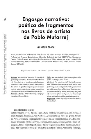 124 Costa, Gil Vieira (2012) “Engasgo narrativo: poética de fragmentos nos livros de artista de Pablo Mufarrej.” Revista :Estúdio, Artistas sobre outras Obras. ISSN 1647-6158, e-ISSN 1647-7316. Vol. 3 (6): 124-128.