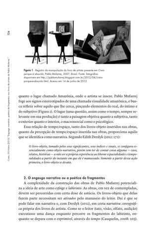 quanto o lugar chamado Amazônia, onde o artista se insere. Pablo Mufarrej foge aos signos estereotipados de uma chamada visualidade amazônica, e busca refletir sobre aquilo que lhe cerca, pinçando elementos do real, do íntimo e do subjetivo (Figura 2). O lugar (uma questão, assim como o tempo, sempre relevante em sua produção) é tanto a paisagem objetiva quanto a subjetiva, tanto o exterior quanto o interior, o macrossocial como o psicológico. Essa relação de tempo/espaço, tanto dos livros-objeto inseridos nas obras, quanto da percepção de tempo/espaço inserida nas obras, proporciona aquilo que se identifica como narrativa. Segundo Edith Derdyk (2012: 171): O livro-objeto, tomado pelos seus significantes, seus índices e sinais, se configura essencialmente como objeto narrativo, porém sem ter de contar coisa alguma — caso, relatos, histórias — a não ser a própria experiência ao liberar espacialidades e temporalidades a partir do instante em que ele é manuseado. Somente a partir dessa ação primeira, o livro-objeto se desata.
