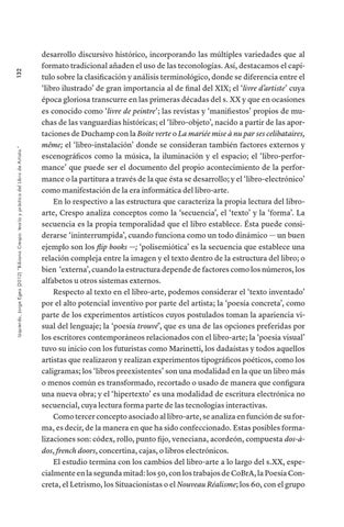 desarrollo discursivo histórico, incorporando las múltiples variedades que al formato tradicional añaden el uso de las teconologías. Así, destacamos el capítulo sobre la clasificación y análisis terminológico, donde se diferencia entre el ‘libro ilustrado’ de gran importancia al de final del XIX; el ‘livre d’artiste’ cuya época gloriosa transcurre en las primeras décadas del s. XX y que en ocasiones es conocido como ‘livre de peintre’; las revistas y ‘manifiestos’ propios de muchas de las vanguardias históricas; el ‘libro-objeto’, nacido a partir de las aportaciones de Duchamp con la Boite verte o La mariée mise à nu par ses celibataires, même; el ‘libro-instalación’ donde se consideran también factores externos y escenográficos como la música, la iluminación y el espacio; el ‘libro-performance’ que puede ser el documento del propio acontecimiento de la performance o la partitura a través de la que ésta se desarrollo; y el ‘libro-electrónico’ como manifestación de la era informática del libro-arte. En lo respectivo a las estructura que caracteriza la propia lectura del libroarte, Crespo analiza conceptos como la ‘secuencia’, el ‘texto’ y la ‘forma’. La secuencia es la propia temporalidad que el libro establece. Ésta puede considerarse ‘ininterrumpida’, cuando funciona como un todo dinámico — un buen ejemplo son los flip books —; ‘polisemiótica’ es la secuencia que establece una relación compleja entre la imagen y el texto dentro de la estructura del libro; o bien ‘externa’, cuando la estructura depende de factores como los números, los alfabetos u otros sistemas externos. Respecto al texto en el libro-arte, podemos considerar el ‘texto inventado’ por el alto potencial inventivo por parte del artista; la ‘poesía concreta’, como parte de los experimentos artísticos cuyos postulados toman la apariencia visual del lenguaje; la ‘poesía trouvé’, que es una de las opciones preferidas por los escritores contemporáneos relacionados con el libro-arte; la ‘poesia visual’ tuvo su inicio con los futuristas como Marinetti, los dadaístas y todos aquellos artistas que realizaron y realizan experimentos tipográficos poéticos, como los caligramas; los ‘libros preexistentes’ son una modalidad en la que un libro más o menos común es transformado, recortado o usado de manera que configura una nueva obra; y el ‘hipertexto’ es una modalidad de escritura electrónica no secuencial, cuya lectura forma parte de las tecnologías interactivas. Como tercer concepto asociado al libro-arte, se analiza en función de su forma, es decir, de la manera en que ha sido confeccionado. Estas posibles formalizaciones son: códex, rollo, punto fijo, veneciana, acordeón, compuesta dos-àdos, french doors, concertina, cajas, o libros electrónicos. El estudio termina con los cambios del libro-arte a lo largo del s.XX, especialmente en la segunda mitad: los 50, con los trabajos de CoBrA, la Poesía Concreta, el Letrismo, los Situacionistas o el Nouveau Réalisme; los 60, con el grupo