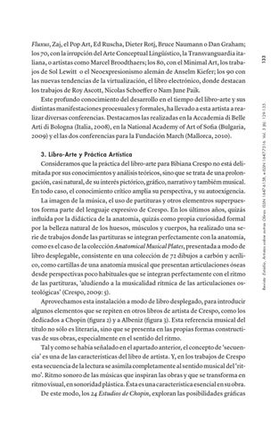 Consideramos que la práctica del libro-arte para Bibiana Crespo no está delimitada por sus conocimientos y análisis teóricos, sino que se trata de una prolongación, casi natural, de su interés pictórico, gráfico, narrativo y tambiém musical. En todo caso, el conocimiento crítico amplia su perspectiva, y su autoexigencia. La imagen de la música, el uso de partituras y otros elementros superpuestos forma parte del lenguaje expresivo de Crespo. En los últimos años, quizás influida por la didáctica de la anatomía, quizás como propia curiosidad formal por la belleza natural de los huesos, músculos y cuerpos, ha realizado una serie de trabajos donde las partituras se integran perfectamente con la anatomía, como es el caso de la colección Anatomical Musical Plates, presentada a modo de libro desplegable, consistente en una colección de 72 dibujos a carbón y acrílico, como cartillas de una anatomía musical que presentan articulaciones óseas desde perspectivas poco habituales que se integran perfectamente con el ritmo de las partituras, ‘aludiendo a la musicalidad rítmica de las articulaciones osteológicas’ (Crespo, 2009: 5). Aprovechamos esta instalación a modo de libro desplegado, para introducir algunos elementos que se repiten en otros libros de artista de Crespo, como los dedicados a Chopin (figura 2) y a Albeniz (figura 3). Esta referencia musical del título no sólo es literaria, sino que se presenta en las propias formas constructivas de sus obras, especialmente en el sentido del ritmo. Tal y como se había señalado en el apartado anterior, el concepto de ‘secuencia’ es una de las características del libro de artista. Y, en los trabajos de Crespo esta secuencia de la lectura se asimila completamente al sentido musical del ‘ritmo’. Ritmo sonoro de las músicas que inspiran las obras y que se transforma en ritmo visual, en sonoridad plástica. Ésta es una característica esencial en su obra. De este modo, los 24 Estudios de Chopin, exploran las posibilidades gráficas