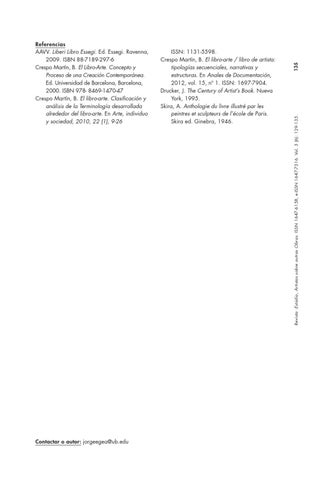 ISSN: 1131-5598. Crespo Martín, B. El libro-arte / libro de artista: tipologías secuenciales, narrativas y estructuras. En Anales de Documentación, 2012, vol. 15, nº 1. ISSN: 1697-7904. Drucker, J. The Century of Artist’s Book. Nueva York, 1995. Skira, A. Anthologie du livre illustré par les peintres et sculpteurs de l’école de Paris. Skira ed. Ginebra, 1946.
