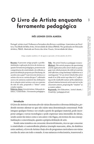 matização e aplicação do Livro de Artista enquanto ferramenta pedagógica, promotora de competências de criatividade e de reflexão, a partir da definição proposta por Duchamp, de acordo com a qual “é um Livro de Artista se o artista o fez ou se o artista diz que é”, refletindo acerca da natureza maleável das definições de (e relação entre) artista e arte no contexto da sala de aula, propondo o “aluno” como criador-sujeito. Palavras chave: Livro de Artista / Educação Artística / Criatividade / Ferramenta pedagógica.