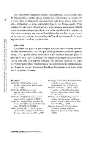 Mas é também o antagonismo entre os dois extremos, início da vida e morte, em simultâneo, que Rui Chafes instaura neste silêncio, que é a sua obra. “Se o criador deve ser ele próprio a criança que se trata de dar à luz, é preciso que ele aceite também ser a mãe em trabalho de parto e as dores do parto.” (Nietzsche, 1988: 94). Como o fluir de um rio e a sua nascente num mesmo instante. A instauração do antagonismo do ser primordial. Aquele que flui mas que, em sincronia, evoca o seu nascimento. Um rio hölderlineano. Um rio que percorre os abismos entre cumes e seca pelo fogo da Vontade numa sucessão de papéis rigorosamente cortados e encadernados. Conclusão