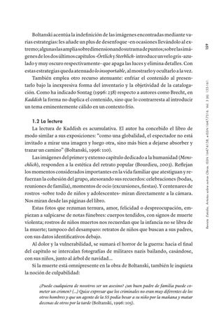 La lectura de Kaddish es acumulativa. El autor ha concebido el libro de modo similar a sus exposiciones: “como una globalidad, el espectador no está invitado a mirar una imagen y luego otra, sino más bien a dejarse absorber y trazar un camino” (Boltanski, 1996: 110). Las imágenes del primer y extenso capítulo dedicado a la humanidad (Menschlich), responden a la estética del retrato popular (Bourdieu, 2003). Reflejan los momentos considerados importantes en la vida familiar que atestiguan y refuerzan la cohesión del grupo, atesorando sus recuerdos: celebraciones (bodas, reuniones de familia), momentos de ocio (excursiones, fiestas). Y centenares de rostros -sobre todo de niños y adolescentes- miran directamente a la cámara. Nos miran desde las páginas del libro. Estas fotos que rezuman ternura, amor, felicidad o despreocupación, empiezan a salpicarse de notas fúnebres: cuerpos tendidos, con signos de muerte violenta; rostros de niños muertos nos recuerdan que la infancia no se libra de la muerte; tampoco del desamparo: retratos de niños que buscan a sus padres, con sus datos identificativos debajo. Al dolor y la vulnerabilidad, se sumará el horror de la guerra: hacia el final del capítulo se intercalan fotografías de militares nazis bailando, casándose, con sus niños, junto al árbol de navidad... Si la muerte está omnipresente en la obra de Boltanski, también le inquieta la noción de culpabilidad: ¿Puede cualquiera de nosotros ser un asesino? ¿un buen padre de familia puede cometer un crimen? (…) Quise expresar que los criminales no eran muy diferentes de los otros hombres y que un agente de la SS podía besar a su niño por la mañana y matar decenas de otros por la tarde (Boltanski, 1996: 105).