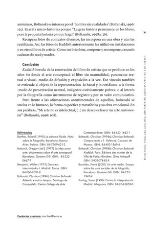 Referencias Barthes, Roland (1990) La cámara lúcida. Nota sobre la fotografía. Barcelona, Buenos Aires: Paidós. ISBN: 84-7509-621-2 Battcock, Gregory [ed.] (1977) La idea como arte: documentos sobre el arte conceptual. Barcelona: Gustavo Gili. ISBN: 84-2520667-7 Benjamin, Walter (1973) Discursos interrumpidos I. Madrid: Taurus. ISBN: 84-306-1091-X Boltanski, Christian (1996) Christian Boltanski: Advento e outros tempos. Santiago de Compostela: Centro Galego de Arte