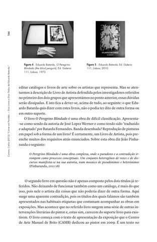 editar catálogos e livros de arte sobre os artistas que representa. Mas se atentarmos à descrição de Livro de Artista defendida pelos investigadores referidos no primeiro dos dois grupos que apresentámos no ponto anterior, essas dúvidas serão dissipadas. E isto fica a dever-se, acima de tudo, ao seguinte: o que Eduardo Batarda quis dizer com estes livros, não o podia ter dito de outra forma ou em outro suporte. O livro O Peregrino Blindado é uma obra de difícil classificação. Apresenta-se como sendo da autoria de José Lopez Werner e como tendo sido ‘traduzido e adaptado’ por Batarda Fernandes. Banda desenhada? Reprodução de pinturas em papel sob a forma de um livro? É certamente, um Livro de Artista, pois preenche muitos dos requisitos atrás enunciados. Sobre esta obra diz João Pinharanda o seguinte: O Peregrino Blindado é uma obra complexa, onde o paradoxo e a contradição irrompem como processos conceptuais. Um conjunto heterogéneo de vozes e de discursos manifesta-se na sua autoria, num mosaico de pseudónimos e heterónimos (Pinharanda, 2011:18)