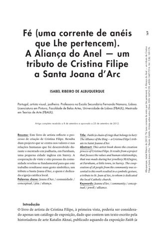 169 Albuquerque, Isabel Ribeiro de (2012) “Fé (uma corrente de anéis que Lhe pertencem). A Aliança do Anel — um tributo de Cristina Filipe a Santa Joana d’Arc.” Revista :Estúdio, Artistas sobre outras Obras. ISSN 1647-6158, e-ISSN 1647-7316. Vol. 3 (6): 169-176.