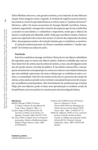 Yukio Mishima descreve, com grande erotismo, nas Confissões de uma Máscara (1949). Estas imagens visam o sagrado. A verdade do suplício encerra uma beleza mística e terrível a que Julia Kristeva se refere como os “poderes do horror” (Kristeva, 1980). Os temas recorrentes de Georges Bataille (sacrifício, êxtase, erotismo angustiado, transgressão e morte) são aspectos que levam o indivíduo a exceder os seus limites e a vislumbrar o impossível, sendo que o objecto de êxtase é criado pela arte (Bataille, 1968). Dado que este filme é mudo, a tónica é posta nas expressões dos rostos dos actores. É através das expressões de Joana d’Arc, das pequenas acções e da variação mínima que se estabelece a narrativa. A variação mínima presente em Dreyer constituiu também o “modus operandi” de Cristina na cadeia de anéis. Conclusão