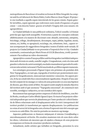 metropolitana de Barcelona i el resultat en format de llibre fotogràfic ha comptat amb la col·laboració de Marta Dahó, Carles Marcos i Joan Nogué. El projecte ens trasllada a aquells espais intersticials de les grans ciutats. Espais gairebé invisibles, espais ignorats que esdevenen oasis rurals d’esquenes a la gran ciutat — com descriu l’autor- gracies al treball i l’enginy dels seus usuaris: els agroperifèrics. La Ciudad Jubilada és una publicació ordinària, l’edició senzilla i el format petit fan que sigui molt assequible. S’estructura a partir de conceptes ordenats alfabèticament a la manera de diccionari com: abandó, autonomia, autopista, bricolatge, collage, desallotjament, descampat, espai, jubilat, legalitat, menú, natura, oci, hobby, re-apropiació, reciclatge, riu, urbanisme, buit,...aquest venen acompanyats de suggeridores fotografies i textos d’índole molt variada. El projecte La Ciudad Jubilada va ser presentat a l’exposició Post-it City. Ciudades ocasionales, comissariada per Martí Peran al CCCB (Barcelona, 2008) i posteriorment s’ha realitzat un video-documental. Agroperifèrics consta d’una peça llibre amb les fotografies i un fulletó independent amb els texts en català, castellà i anglès. L’enquadernat, cosit a la vista amb guardes i cobertes de cartró semirígid, encolades manualment i gravades li confereix un valor artístic i artesanal. S’ha fet una tirada de 411 llibres signats i numerats. Les estratègies processuals d’Ignasi López són pròximes als postulats dels New Topographics, en tant que, topografia el territori per posteriorment enregistrar-lo fotogràficament, intercanviant memòria i emocions. En aquest procés, hi ha un estudi dels llocs emocionalment significatius. Després d’una anàlisi del conjunt de les imatges es valora els seus potencials i es crea una hipòtesi de discurs, que dóna sentit al llibre. En aquest sentit amplia la mirada objectiva del territori amb el què anomena “Topografia emocional”, de connotació més sensible, nostàlgica i subjectiva, no tan científica dels espais. Recentment han aparegut petites empreses d’edició de fotollibres, com Bside Books, creada per Carlos Albalá i Ignasi López. Es tracta d’un projecte editorial independent que serveix de plataforma per l’auto-producció i edició limitada de llibres relacionats amb el desplaçament urbà i la visió i interpretació del territori produït i/o transformat per aquests desplaçaments. Les publicacions no estan al servei de la fotografia com a forma d’expressió sinó del concepte que es tracta en cada llibre. Per això les portades no mostren cap imatge. Aquestes publicacions es financen mitjançant el sistema Crowdfunding o microfinançament col·lectiu. Els creadors mantenen tots els seus drets sobre les obres, i ofereixen als mecenes que els ajuden a finançar els seus projectes recompenses en forma de creacions i productes exclusius. Actualment, molts artistes que treballen en fotografia, presenten la seva