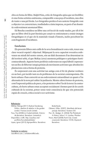 Referències McKay, George (2011) Radical Gardening. Politics, idealism & rebelion in the garden. London: Frances Lincoln Limited. Faus, Pau (2008) La Ciudad Jubilada. Entorno de Barcelona. Barcelona. Autoedició. Disponible a <URL: http://paufaus.net/ portfolio/la-ciudad-jubilada/ Lopez, Ignasi (2012) Agroperifèrics. Barcelona: