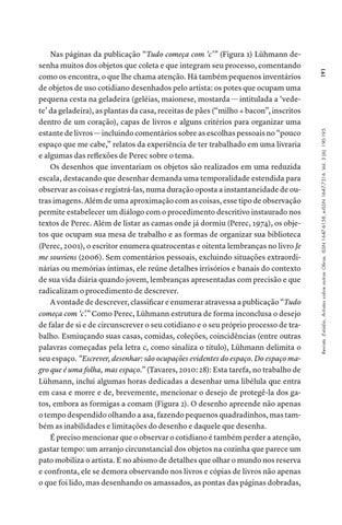 Nas páginas da publicação “Tudo começa com ‘c’” (Figura 1) Lühmann desenha muitos dos objetos que coleta e que integram seu processo, comentando como os encontra, o que lhe chama atenção. Há também pequenos inventários de objetos de uso cotidiano desenhados pelo artista: os potes que ocupam uma pequena cesta na geladeira (geléias, maionese, mostarda — intitulada a ‘vedete’ da geladeira), as plantas da casa, receitas de pães (“milho + bacon”, inscritos dentro de um coração), capas de livros e alguns critérios para organizar uma estante de livros — incluindo comentários sobre as escolhas pessoais no “pouco espaço que me cabe,” relatos da experiência de ter trabalhado em uma livraria e algumas das reflexões de Perec sobre o tema. Os desenhos que inventariam os objetos são realizados em uma reduzida escala, destacando que desenhar demanda uma temporalidade estendida para observar as coisas e registrá-las, numa duração oposta a instantaneidade de outras imagens. Além de uma aproximação com as coisas, esse tipo de observação permite estabelecer um diálogo com o procedimento descritivo instaurado nos textos de Perec. Além de listar as camas onde já dormiu (Perec, 1974), os objetos que ocupam sua mesa de trabalho e as formas de organizar sua biblioteca (Perec, 2001), o escritor enumera quatrocentas e oitenta lembranças no livro Je me souviens (2006). Sem comentários pessoais, excluindo situações extraordinárias ou memórias íntimas, ele reúne detalhes irrisórios e banais do contexto de sua vida diária quando jovem, lembranças apresentadas com precisão e que radicalizam o procedimento de descrever. A vontade de descrever, classificar e enumerar atravessa a publicação “Tudo começa com ‘c’.” Como Perec, Lühmann estrutura de forma inconclusa o desejo de falar de si e de circunscrever o seu cotidiano e o seu próprio processo de trabalho. Esmiuçando suas casas, comidas, coleções, coincidências (entre outras palavras começadas pela letra c, como sinaliza o título), Lühmann delimita o seu espaço. “Escrever, desenhar: são ocupações evidentes do espaço. Do espaço magro que é uma folha, mas espaço.” (Tavares, 2010: 28): Esta tarefa, no trabalho de Lühmann, inclui algumas horas dedicadas a desenhar uma libélula que entra em casa e morre e de, brevemente, mencionar o desejo de protegê-la dos gatos, embora as formigas a comam (Figura 2). O desenho apreende não apenas o tempo despendido olhando a asa, fazendo pequenos quadradinhos, mas também as inabilidades e limitações do desenho e daquele que desenha. É preciso mencionar que o observar o cotidiano é também perder a atenção, gastar tempo: um arranjo circunstancial dos objetos na cozinha que parece um pato mobiliza o artista. E no abismo de detalhes que olhar o mundo nos reserva e confronta, ele se demora observando nos livros e cópias de livros não apenas o que foi lido, mas desenhando os amassados, as pontas das páginas dobradas,