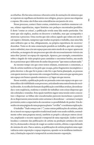 as rebarbas. Ele faz uma extensa e obsessiva série de anotações de números que se repetem ou espelham em horários nos relógios, preços e pesos nas etiquetas e cupons. Ele conta: são 8 dias sem coincidências em janeiro de 2011. Nesse processo, contar é fazer contas, estatísticas e também enumerar coisas, relatar experiências, supor histórias nos pedaços encontrados/perdidos. E deste ‘contar as coisas’, a publicação revela uma fala muito particular. Um texto que não explica, analisa ou descreve o trabalho, mas que acompanha e atravessa o processo. Uma escrita que não coloca aquele que relata em um local seguro e distante, tampouco que traduz ou projeta o trabalho, mas uma fala auto-reflexiva que se faz, obliquamente, na própria experiência de escrever/ desenhar. Trata-se de uma enunciação paralela ao trabalho, que não compete nem o substitui, mas cria um espaço para um outro modo de se expor: aparecem as bordas, as margens de um processo que não são necessariamente visíveis em uma obra ‘pronta’ no espaço de exposição. Aparece, por exemplo, comentários sobre o ângulo de visão propício para caminhar e encontrar botões, um modo de se posicionar que é diferente do andar das pessoas “que nunca acham nada.” Ao mesmo tempo em que estes textos relatam, enumeram e comentam, a fala do artista também se faz pelo que escapa, pelos fragmentos incompletos e pelos desvios: o dia que foi à praia e não fez o que havia planejado, as pessoas com quem morou e cujo nome não consegue lembrar, uma seta que aponta para um espaço em branco quando enumera o 23o lugar em que morou. Nesse sentido, a publicação pode ser pensada como um espaço em que o artista edita e dá visibilidade a um processo, articulando uma outra forma de escrita/desenho. A escolha do formato da publicação com folhas avulsas, desordenadas e sem seqüência, reafirma o sentido de trabalhar com coisas dispersas que são coletadas e reunidas. Esta opção também sugere uma tensão entre concentrar e dispersar: as folhas não-encadernadas parecem inconclusas e passíveis de se dispersarem; uma tensão entre arrumar e desordenar — arrumar é sempre provisório; entre a expectativa de encontrar e a possibilidade de perder. Um desenho em uma página de uma pequena planta: “ervilha”: e nenhuma explicação. O trabalho “Tudo começa com ‘c’”, como outras publicações de artistas, além de se inserir no espaço expositivo tradicional (onde vem sendo exibido, normalmente sobre uma pequena mesa), também se propõe a alcançar outros circuitos, ampliando o recorte espacial e temporal de uma exposição. Linker (2008) localiza o contexto das publicações de artista na produção artística dos anos 60/70, destacando o desejo de reagir ao caráter restrito, elitista e especializado do sistema de arte. Para a autora, as publicações de artista propõem uma equivalência entre exposição e espaço impresso, opondo-se às molduras institucionais, à limitação espacial e temporal do acontecimento-exposição.
