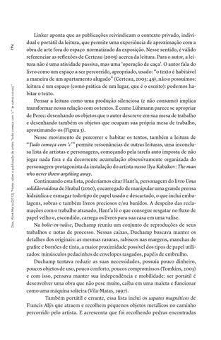 Linker aponta que as publicações reivindicam o contexto privado, individual e portátil da leitura, que permite uma experiência de aproximação com a obra de arte fora do espaço normatizado da exposição. Nesse sentido, é válido referenciar as reflexões de Certeau (2003) acerca da leitura. Para o autor, a leitura não é uma atividade passiva, mas uma ‘operação de caça’. O autor fala do livro como um espaço a ser percorrido, apropriado, usado: “o texto é habitável a maneira de um apartamento alugado” (Certeau, 2003: 49), não o possuímos: leitura é um espaço (como prática de um lugar, que é o escrito): podemos habitar o texto. Pensar a leitura como uma produção silenciosa (e não consumo) implica transformar nossa relação com os textos. É como Lühmann parece se apropriar de Perec: desenhando os objetos que o autor descreve em sua mesa de trabalho e desenhando também os objetos que ocupam sua própria mesa de trabalho, aproximando-os (Figura 3). Nesse movimento de percorrer e habitar os textos, também a leitura de “Tudo começa com ‘c’” permite ressonâncias de outras leituras, uma inconclusa lista de artistas e personagens, começando pela tarefa auto imposta de não jogar nada fora e da decorrente acumulação obsessivamente organizada do personagem-protagonista da instalação do artista russo Ilya Kabakov: The man who never threw anything away. Continuando esta lista, poderíamos citar Hant’a, personagem do livro Uma solidão ruidosa de Hrabal (2010), encarregado de manipular uma grande prensa hidráulica e esmagar todo tipo de papel usado e descartado, o que inclui embalagens, sobras e também livros preciosos e/ou banidos. A despeito das reclamações com o trabalho atrasado, Hant’a lê o que consegue resgatar no fluxo de papel velho e, escondido, carrega os livros para sua casa em uma valise. Na boîte-en-valise, Duchamp reuniu um conjunto de reproduções de seus trabalhos e notas de processo. Nessas caixas, Duchamp buscava manter os detalhes dos originais: as mesmas rasuras, rabiscos nas margens, manchas de grafite e borrões de tinta, a maior proximidade possível dos tipos de papel utilizados: minúsculos pedacinhos de envelopes rasgados, papéis de embrulho. Duchamp tentava reduzir as suas necessidades, possuía pouco dinheiro, poucos objetos de uso, pouco conforto, poucos compromissos (Tomkins, 2005) e com isso, pensava manter sua independência e mobilidade: ser portátil é desenvolver uma obra que não pese muito, caiba em uma maleta e funcionar como uma máquina solteira (Vila-Matas, 1997). Também portátil e errante, essa lista inclui os sapatos magnéticos de Francis Alÿs que atraem e recolhem pequenos objetos metálicos no caminho percorrido pelo artista. E acrescenta que foi recolhendo pedras encontradas