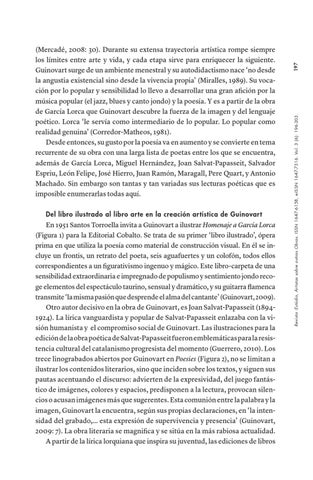 En 1951 Santos Torroella invita a Guinovart a ilustrar Homenaje a García Lorca (Figura 1) para la Editorial Cobalto. Se trata de su primer ‘libro ilustrado’, ópera prima en que utiliza la poesía como material de construcción visual. En él se incluye un frontis, un retrato del poeta, seis aguafuertes y un colofón, todos ellos correspondientes a un figurativismo ingenuo y mágico. Este libro-carpeta de una sensibilidad extraordinaria e impregnado de populismo y sentimiento jondo recoge elementos del espectáculo taurino, sensual y dramático, y su guitarra flamenca transmite ‘la misma pasión que desprende el alma del cantante’ (Guinovart, 2009). Otro autor decisivo en la obra de Guinovart, es Joan Salvat-Papasseit (18941924). La lírica vanguardista y popular de Salvat-Papasseit enlazaba con la visión humanista y el compromiso social de Guinovart. Las ilustraciones para la edición de la obra poética de Salvat-Papasseit fueron emblemáticas para la resistencia cultural del catalanismo progresista del momento (Guerrero, 2010). Los trece linograbados abiertos por Guinovart en Poesies (Figura 2), no se limitan a ilustrar los contenidos literarios, sino que inciden sobre los textos, y siguen sus pautas acentuando el discurso: advierten de la expresividad, del juego fantástico de imágenes, colores y espacios, predisponen a la lectura, provocan silencios o acusan imágenes más que sugerentes. Esta comunión entre la palabra y la imagen, Guinovart la encuentra, según sus propias declaraciones, en ‘la intensidad del grabado,… esta expresión de supervivencia y presencia’ (Guinovart, 2009: 7). La obra literaria se magnifica y se sitúa en la más rabiosa actualidad. A partir de la lírica lorquiana que inspira su juventud, las ediciones de libros