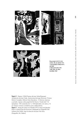Figura 2 ∙ Poesies. (1962) Poemas de Joan Salvat-Papasseit, introducción de Joan Fuster, ilustraciones de Josep Guinovart. Primera Edición Completa. Editorial Ariel, Barcelona. 12 láminas interiores y portada, impreso sobre papel de hilo Guarro. Tirada total 116 ejemplares: 100 numerados de 1 a 100 destinados a la venta y 16 en números romanos correlativos para colaboradores. Figura 3 ∙ Assaig de càntic en el temple (1971) versos de Salvador Espriu e ilustraciones de Guinovart, estampado en Filograf-R.G.M. Institute d’Art Gràfic, bajo la dirección de Joan Vila Grau. (Fotografía: M.J. Botero)